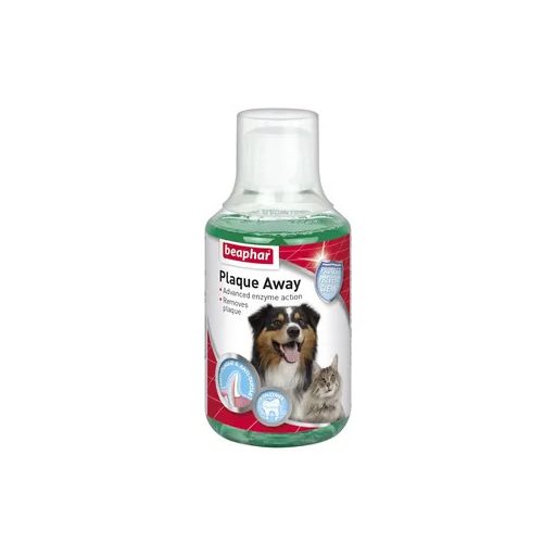 A Beaphar Plaque Away szájvíz 250 ml ideális kiegészítő a napi szájápoláshoz: megelőzi a lepedék és fogkő kialakulását, biztosítja a friss leheletet, és könnyen adagolható ivóvízhez. Kutyáknak és macskáknak egyaránt – 6 hónapos kortól – hatékony és praktikus megoldás a szájhigiénia támogatására.
