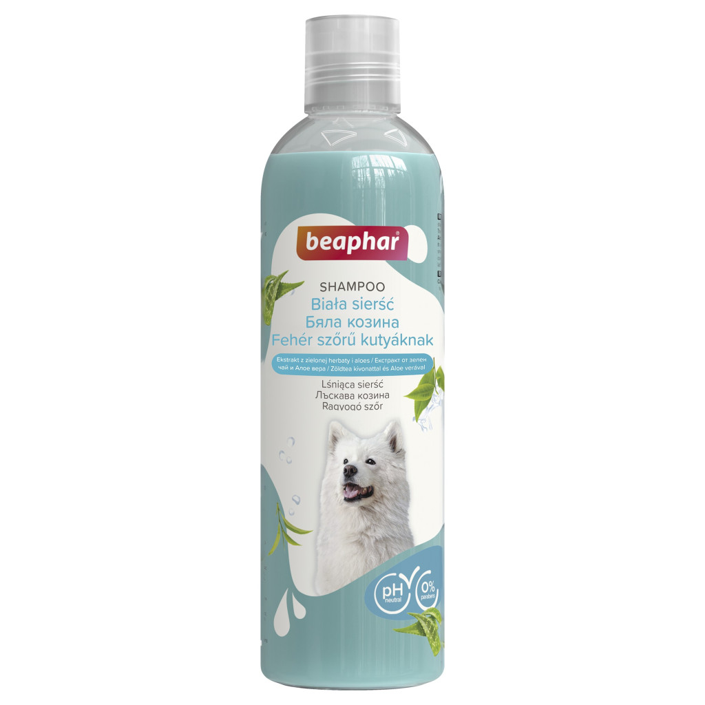 A Beaphar sampon zöld teával fehér szőrű kutyáknak (250 ml) kifejezetten a fehér és világos szőrű kutyák érzékeny bőrére fejlesztett, pH-semleges sampon. A zöld tea kivonat és az Aloe vera hidratálja a bőrt, puhává és fényessé teszi a szőrt, miközben segít megőrizni a bunda természetes, ragyogó fehér színét. A formula parabén- és szilikonmentes, friss, tiszta illatot hagy.