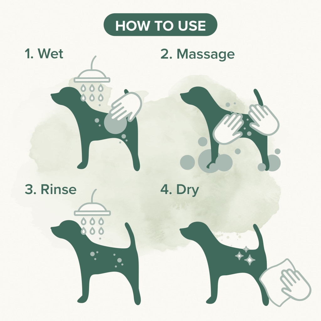 Nedvesítse meg a bundát meleg vízzel, vigye fel a sampont, finoman masszírozza bele a szőrzetbe, amíg jó hab képződik. Alaposan öblítse ki, majd törölje vagy szárítsa meg kedvencét.
